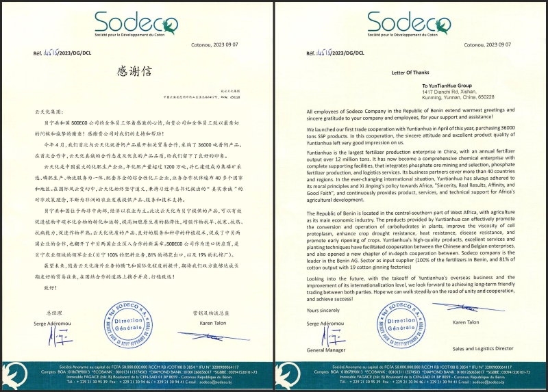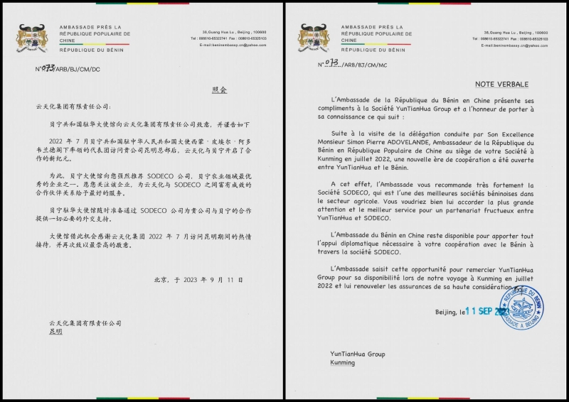 9月8日,云天化收到貝寧SODECO公司的感謝信,信中,貝寧SODECO公司及其全體員工對(duì)云天化向他們提供的產(chǎn)品、服務(wù)和科學(xué)種植技術(shù)表示了誠摯的感謝,表達(dá)了與云天化攜手并進(jìn),促進(jìn)中、非企業(yè)合作交流的良好愿望。9月11日,云天化收到貝寧共和國駐華大使館發(fā)來的照會(huì),對(duì)2022年貝寧共和國駐華大使西蒙·皮埃爾·阿多維蘭德到訪云天化給予的熱情接待表示感謝,表示愿意為云天化與貝寧農(nóng)業(yè)領(lǐng)域最好的企業(yè)——SODECO公司的合作給予最好的服務(wù)。