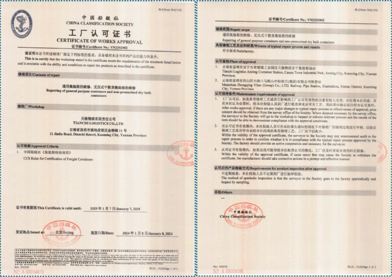 中國船級社(簡稱“CCS”)前身是中華人民共和國船舶檢驗局,是國家交通運輸部直屬事業(yè)單位,是國家海關(guān)總署、中國國家鐵路集團授權(quán),對海關(guān)監(jiān)管貨物的集裝箱和符合國家鐵路運輸要求的集裝箱制造、改裝、維修和相關(guān)牌照批準(zhǔn)、發(fā)證的唯一單位。據(jù)了解,中國船級社嚴(yán)格審批、發(fā)放集裝箱修箱資質(zhì)證書,均為一年一檢,目前中國船級社在云南管轄區(qū)域內(nèi)已發(fā)證且在有效期內(nèi)的集裝箱修箱企業(yè)(廠)僅2家,云天化天馳物流是中國鐵路昆明局集團管轄范圍內(nèi)云南企業(yè)中唯一取得修箱資質(zhì)且在有效期內(nèi)的企業(yè)。(文/圖 師曉青)